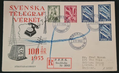 SWEDEN 1953 FDC REGISTERED ‘Anniversary Telegraphs’ STOCKHOLM 2-11-53