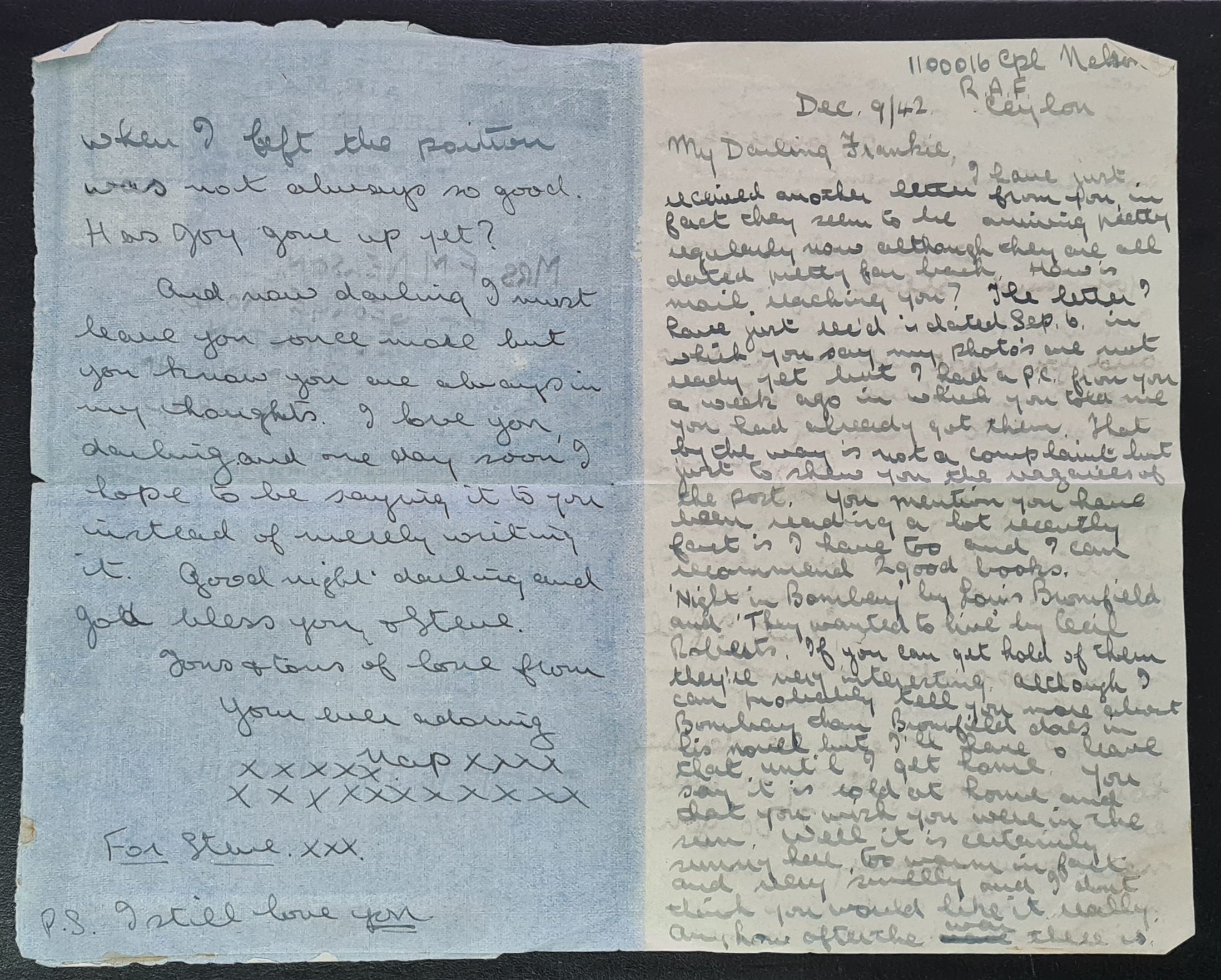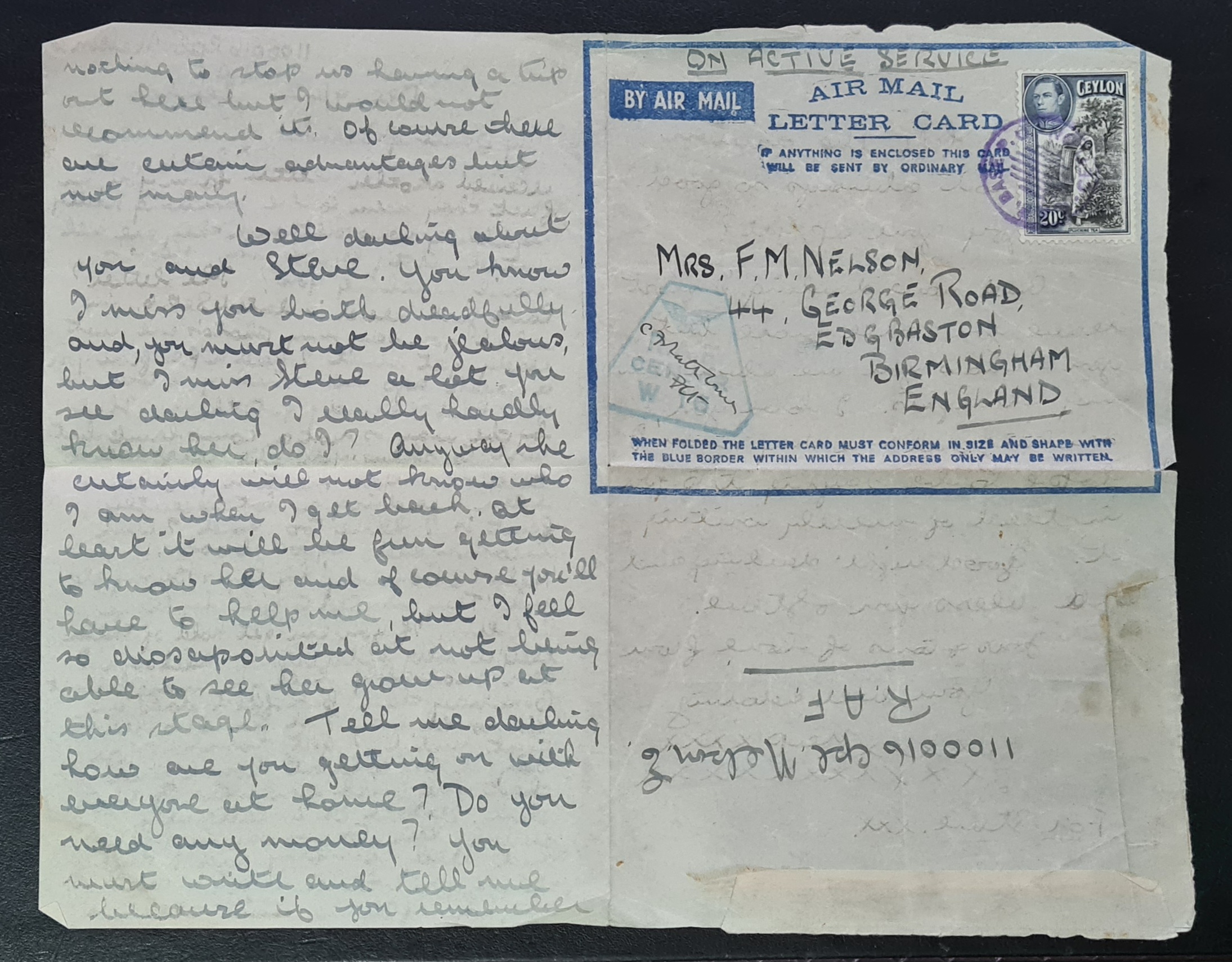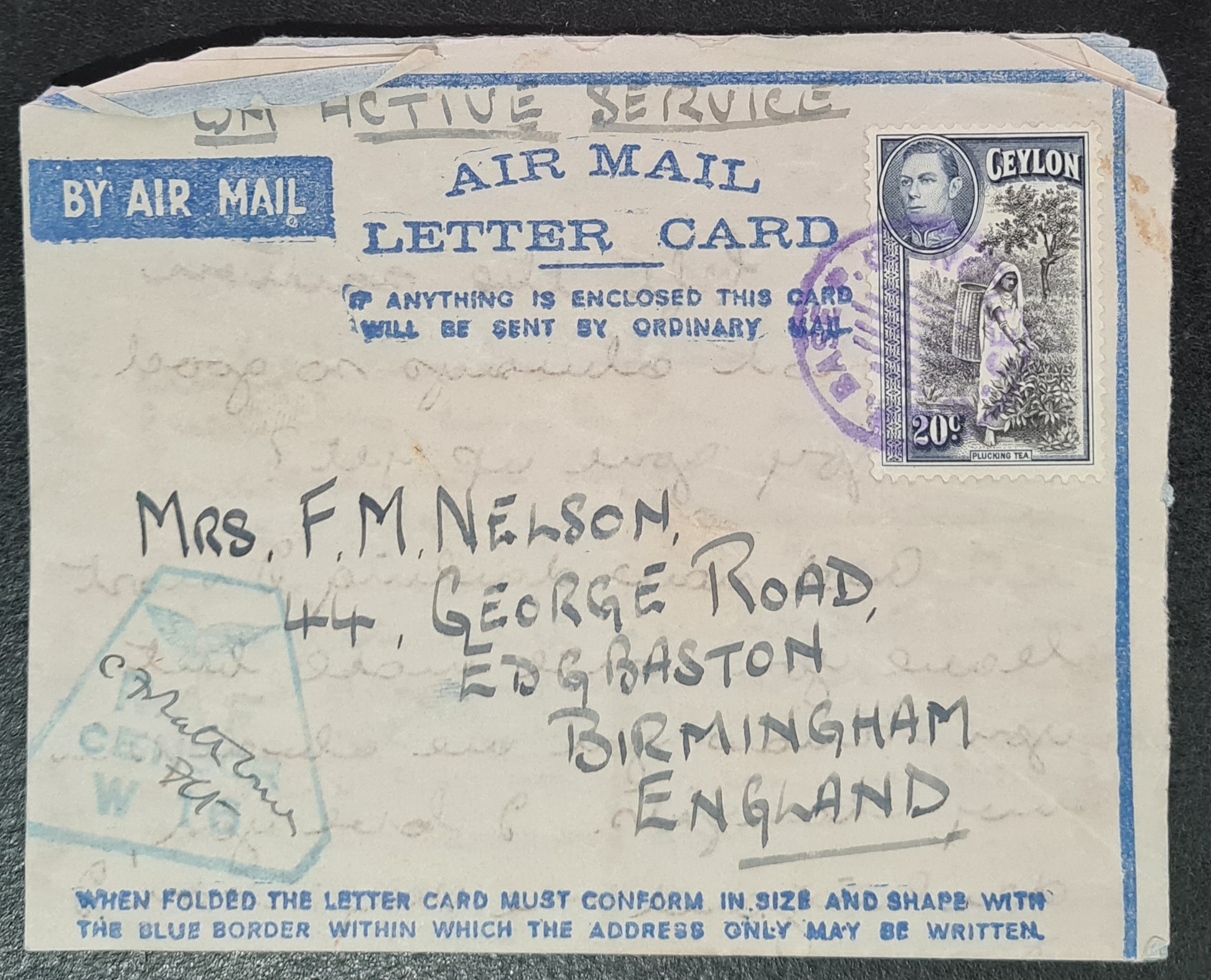 Ceylon 1943 Airmail Censored Lettercard R.A.F