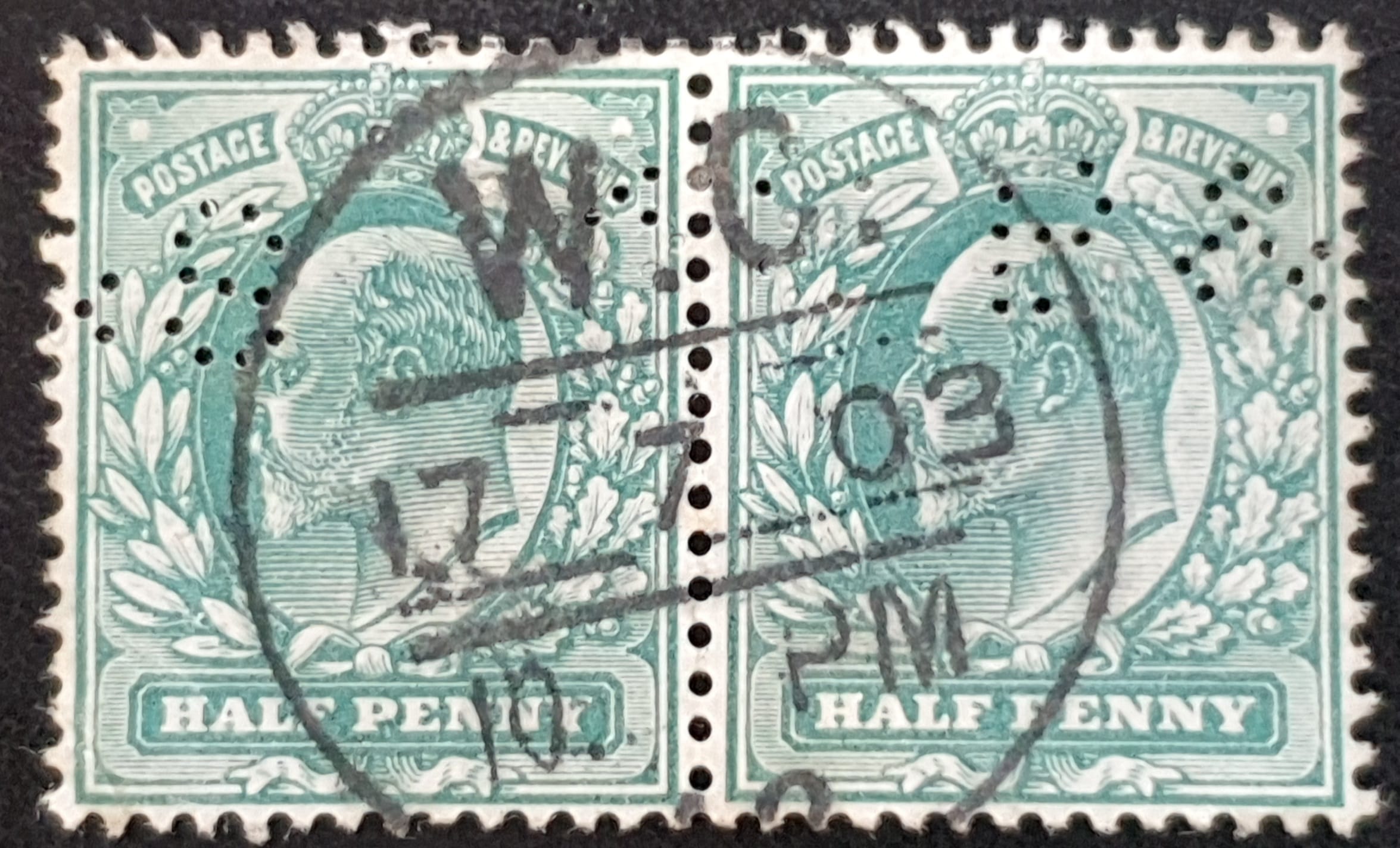 Great Britain King Edward VII 1903 SG216 ½d. blue green Perfin. used pair