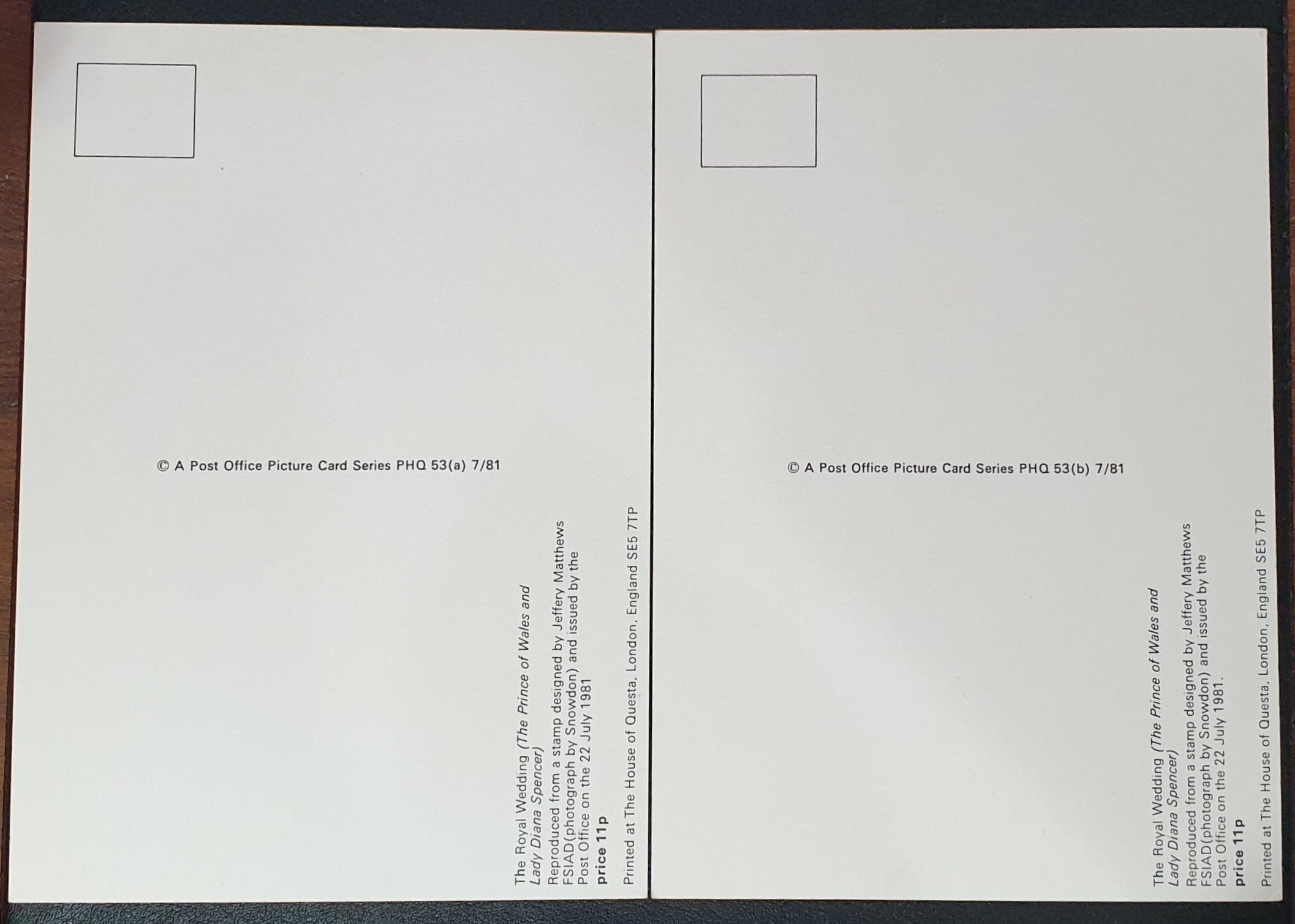 Great Britain 1981 PHQ Cards (set of 2) No.53(a-b) 7/81 “The Royal Wedding (The Prince of Wales and Lady Diana Spencer)” MNH