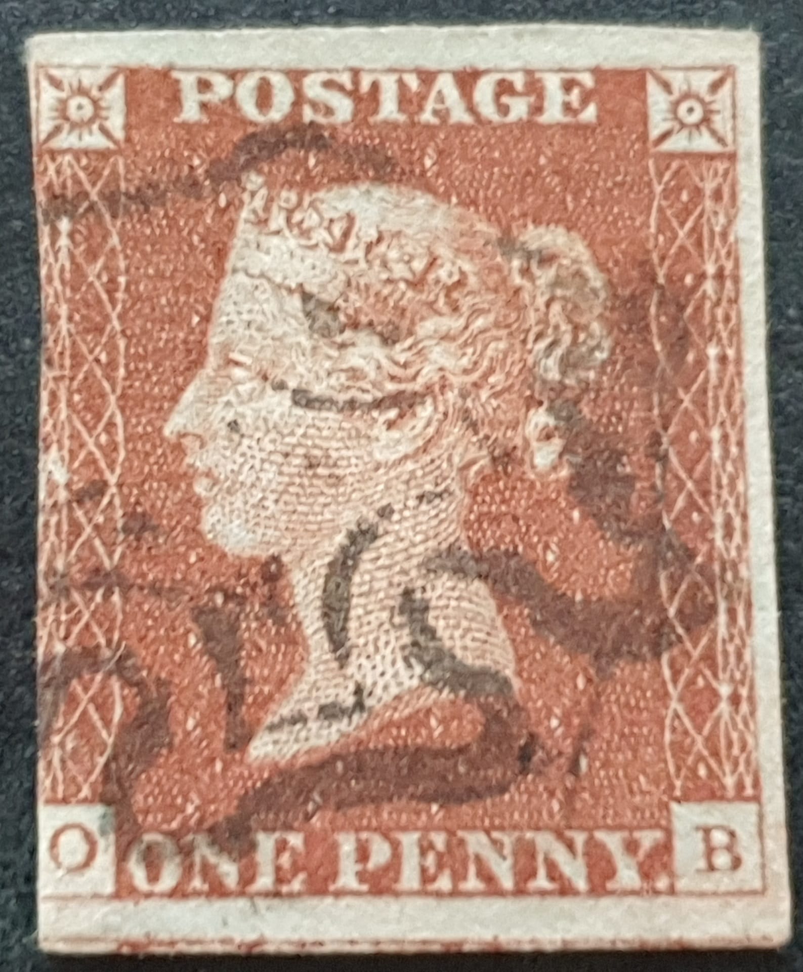 Great Britain Queen Victoria SG8 1d. red-brown Letters O-B Black MX Plate 28 used stamp