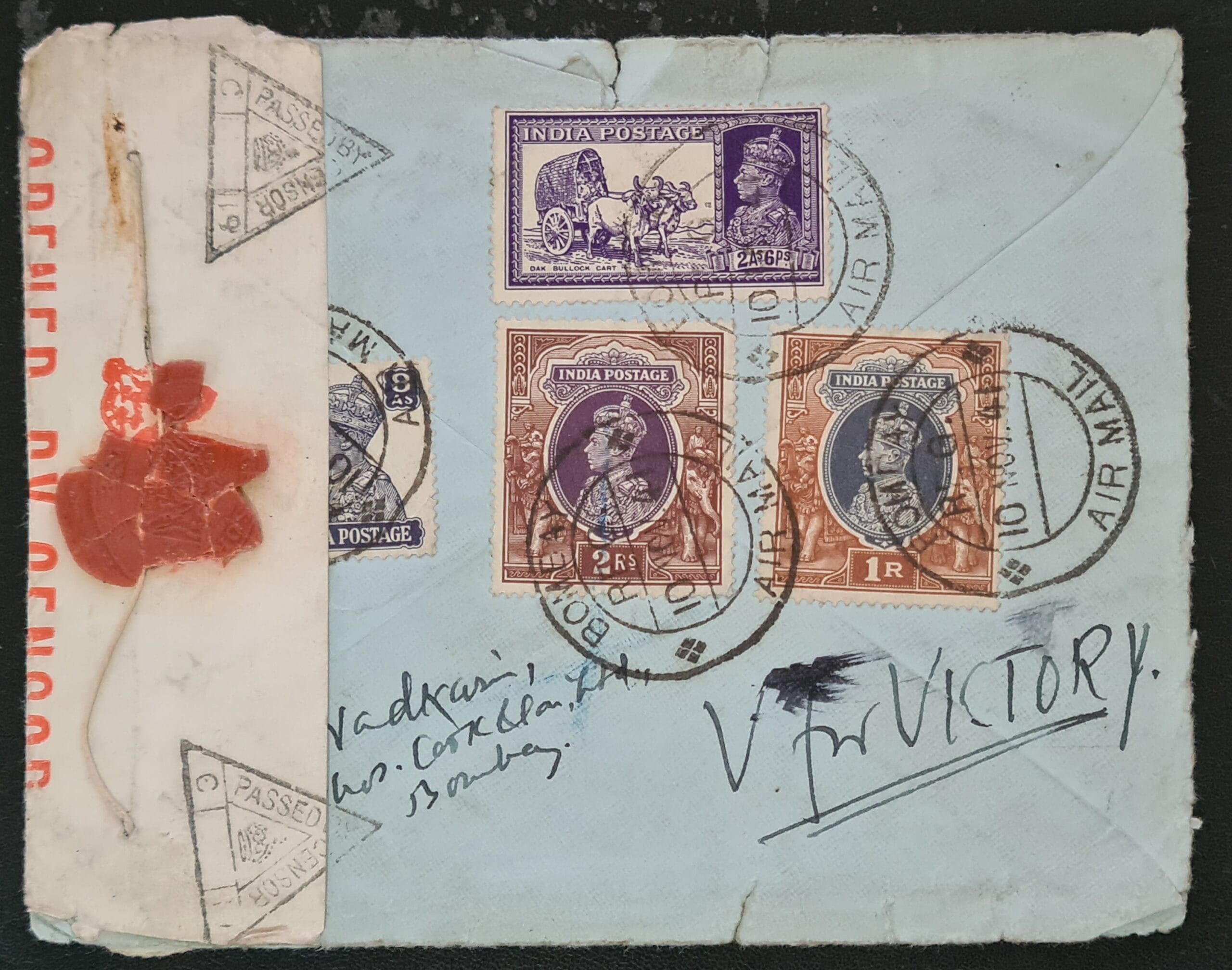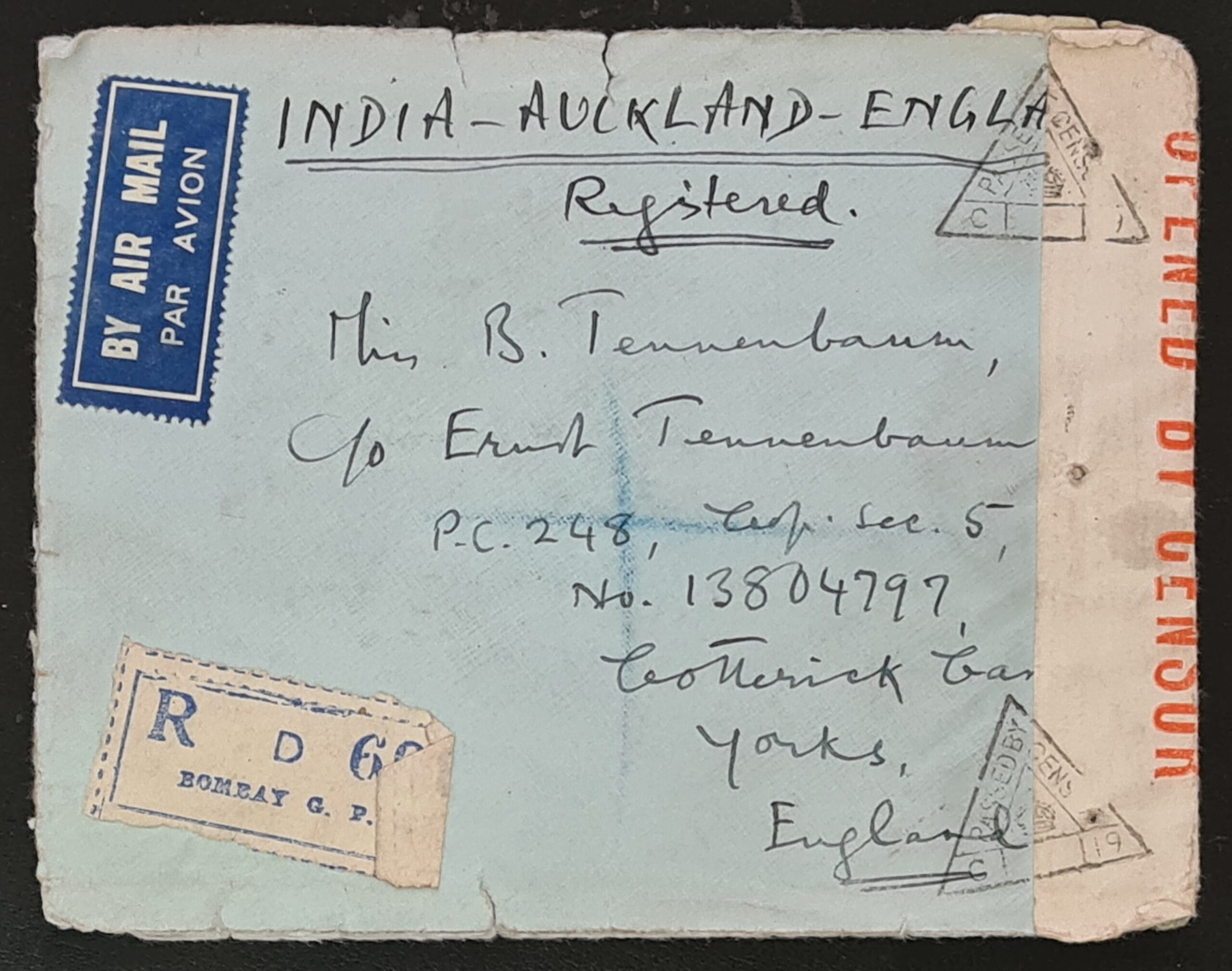 India 1941 Registered Cover from Bombay to Yorkshire England